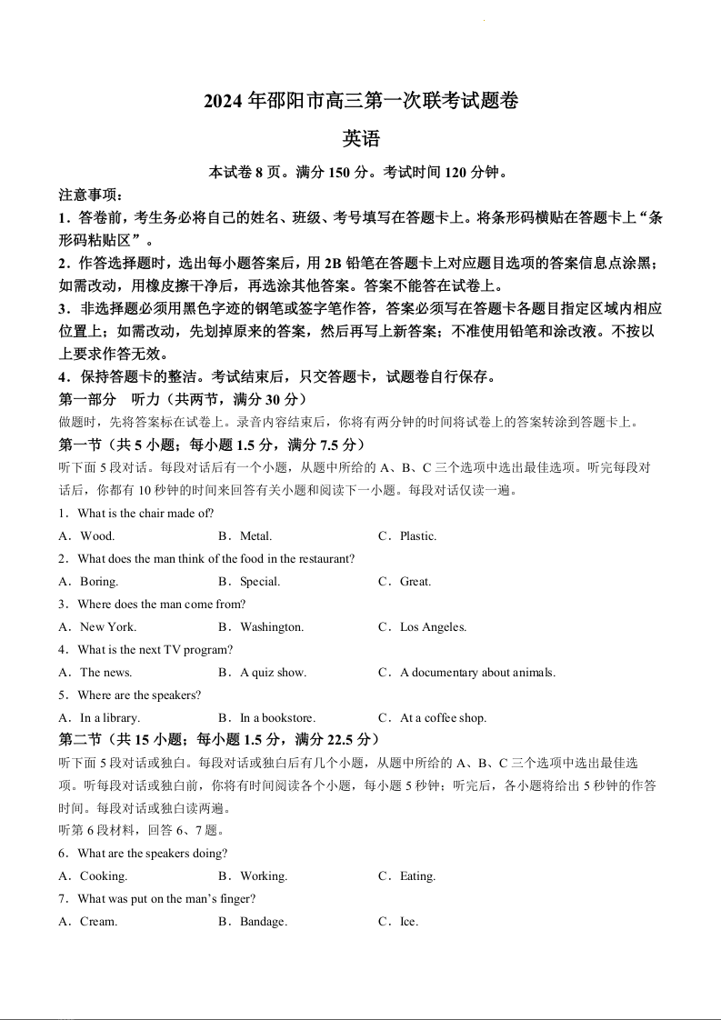 湖南省邵阳市2024届高三第一次联考(邵阳一模)英语+答案