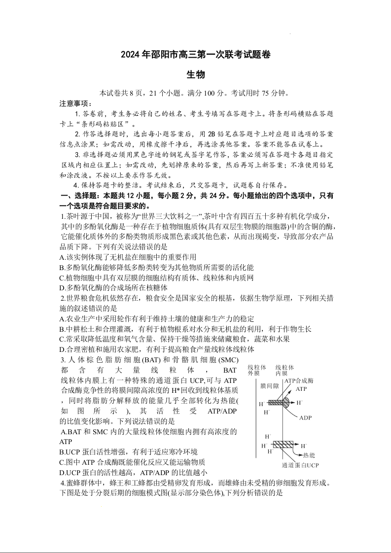 湖南省邵阳市2024届高三第一次联考(邵阳一模)生物+答案
