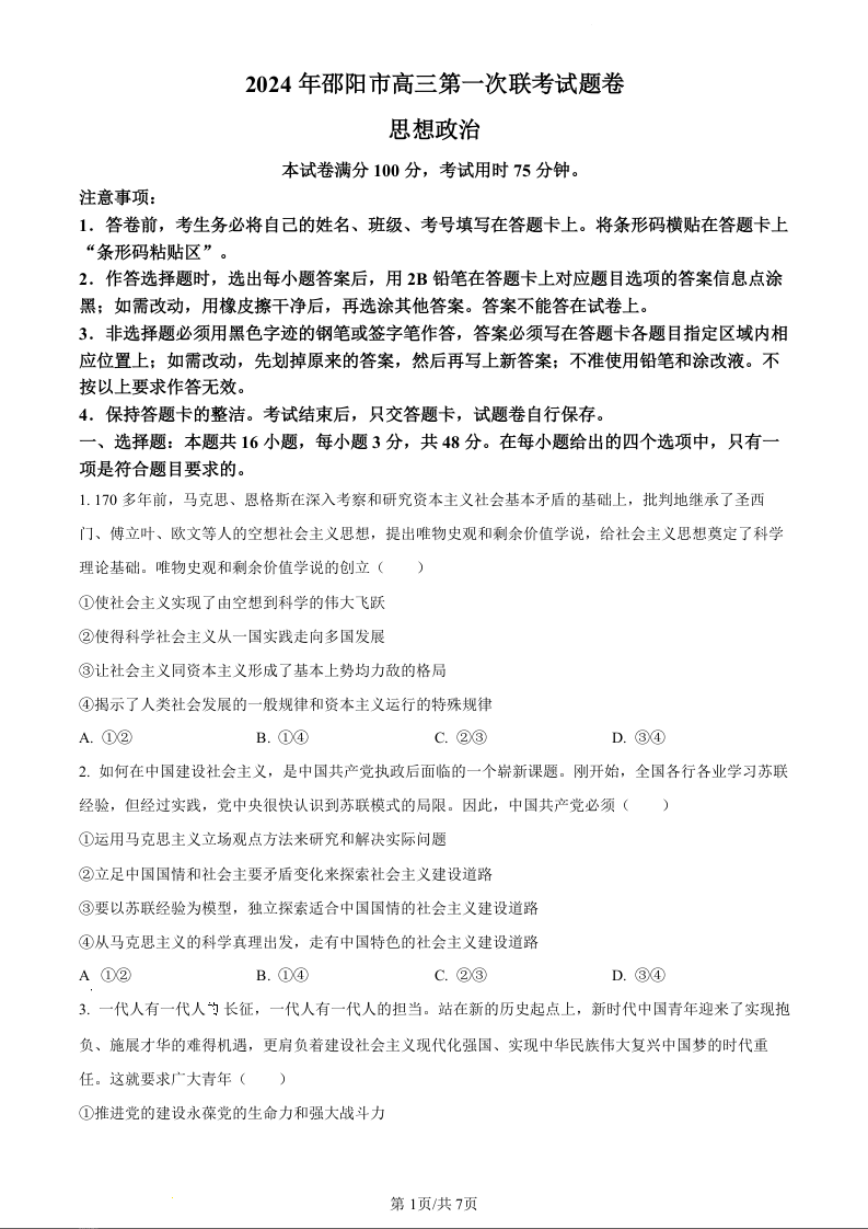 湖南省邵阳市2024届高三第一次联考(邵阳一模)政治(原卷版)