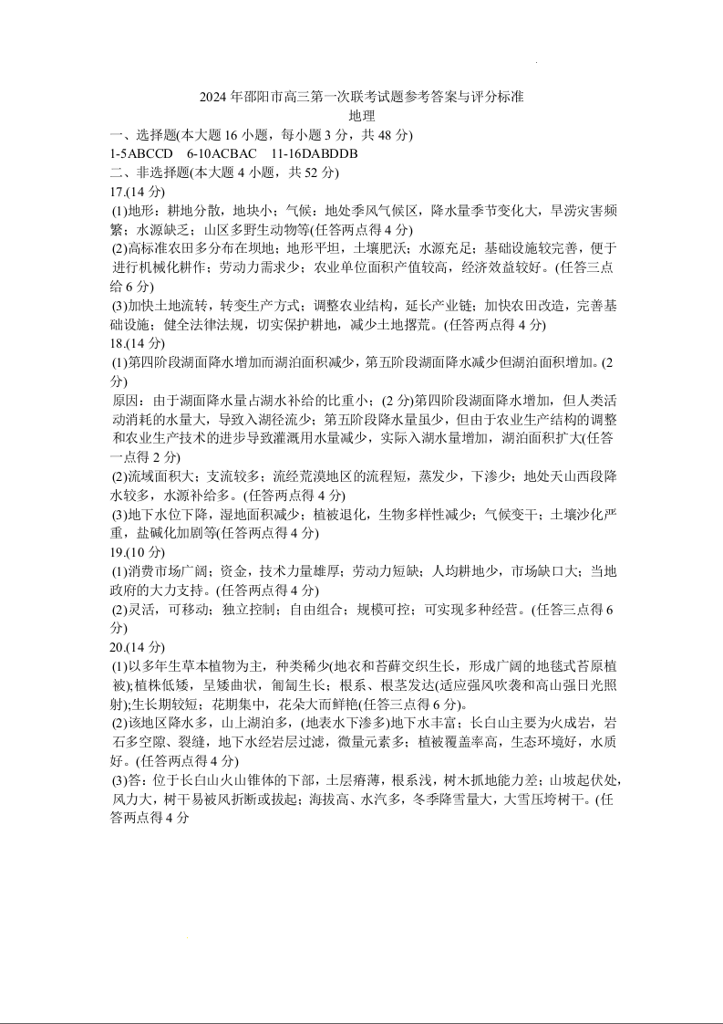 湖南省邵阳市2024届高三第一次联考(邵阳一模)地理答案