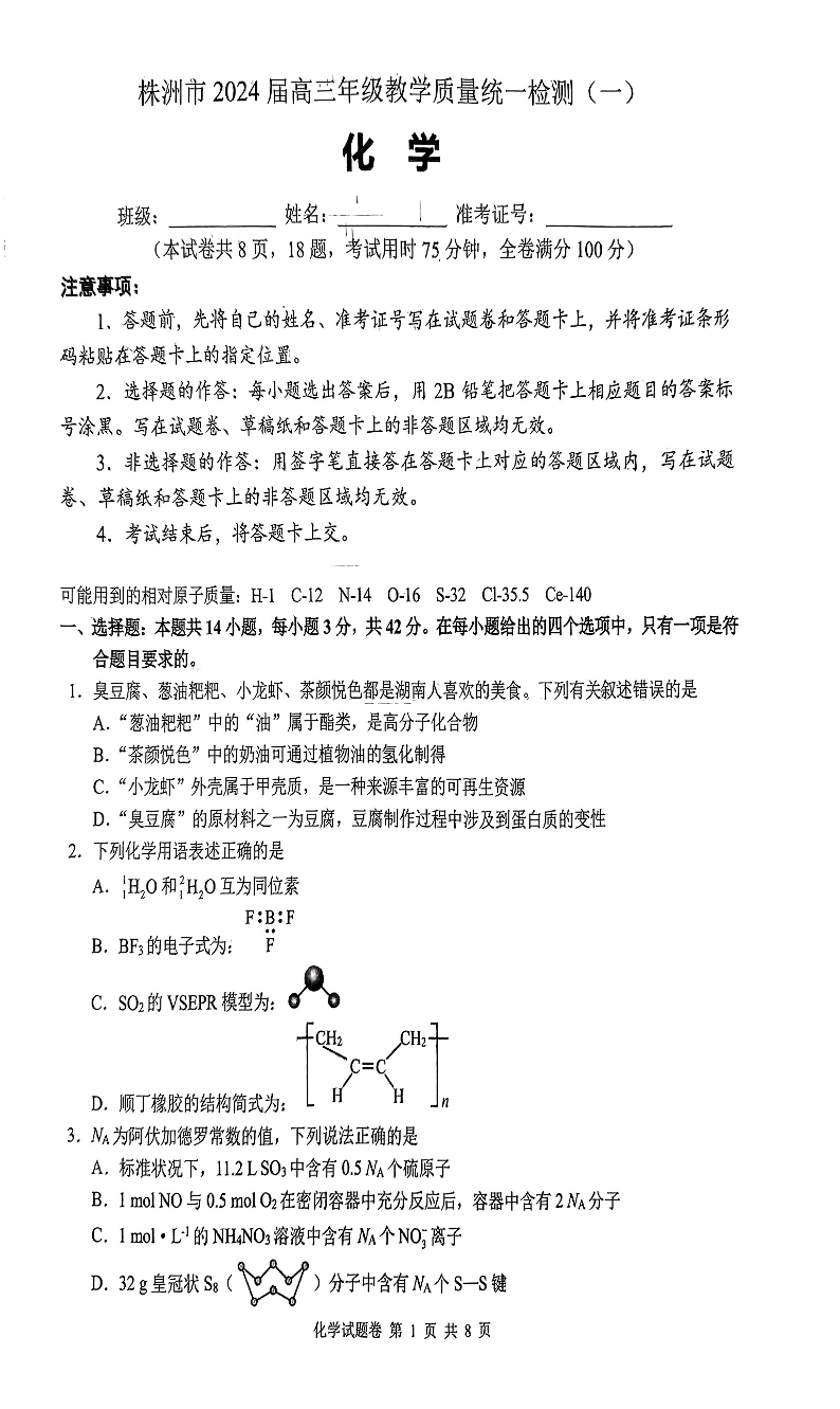 湖南省株洲市2024届高三上学期教学质量统一检测(一)化学