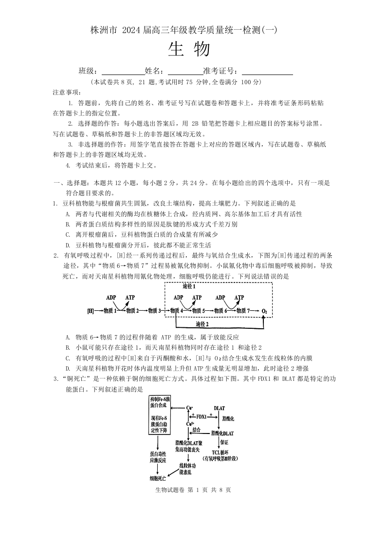 湖南省株洲市2024届高三上学期教学质量统一检测(一)生物