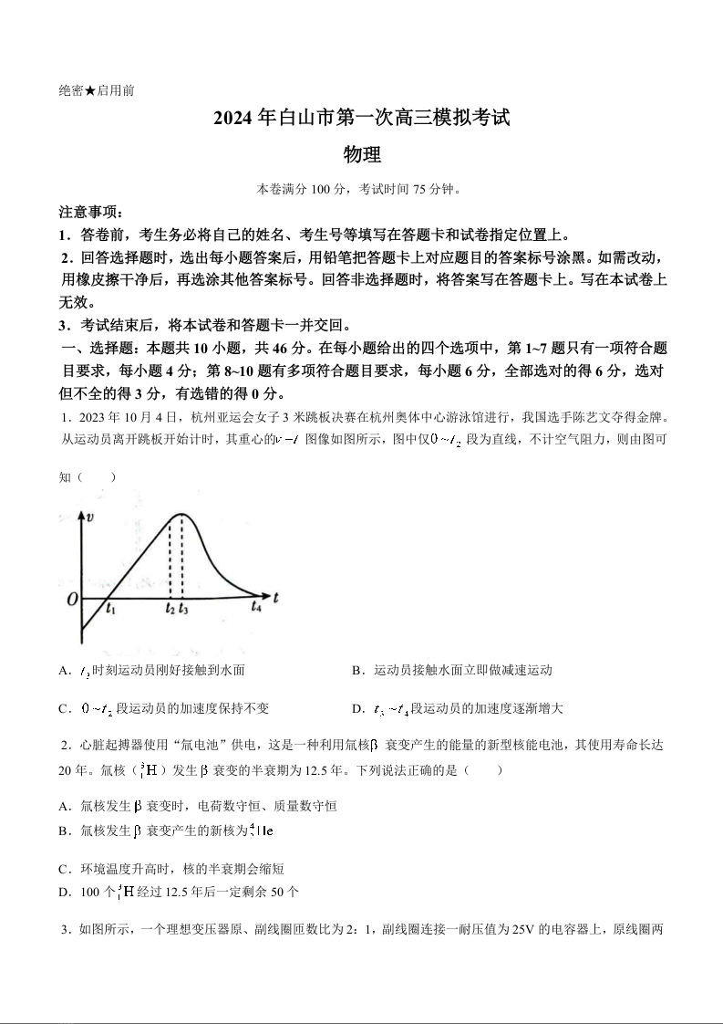 吉林省白山市2024届高三第一次模拟考试物理+答案