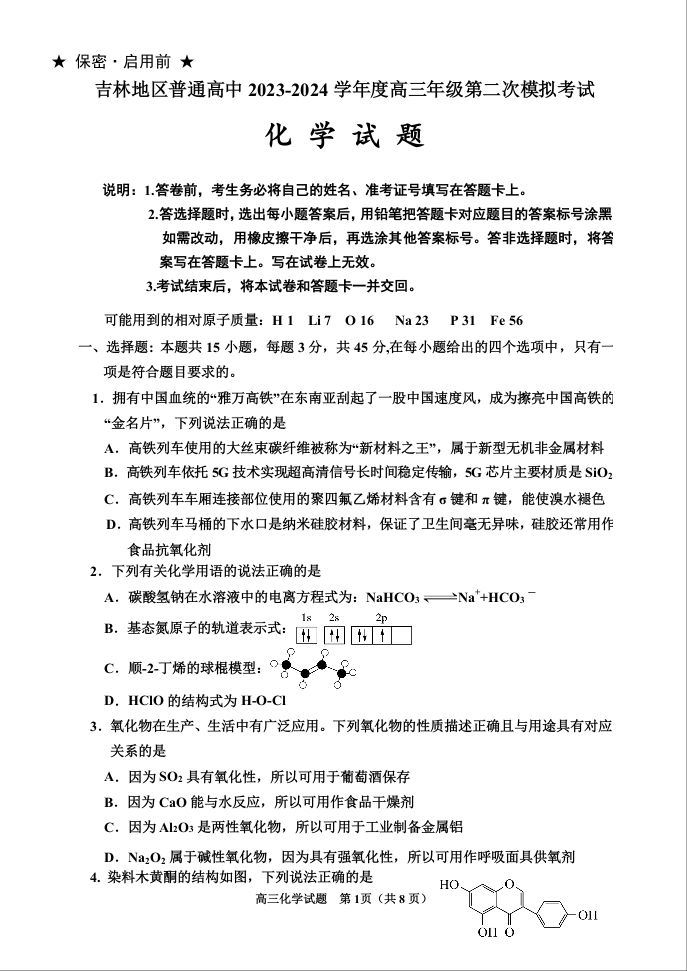 吉林省吉林市2024届高三上学期第二次模拟考试化学
