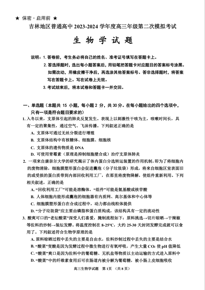 吉林省吉林市2024届高三上学期第二次模拟考试生物