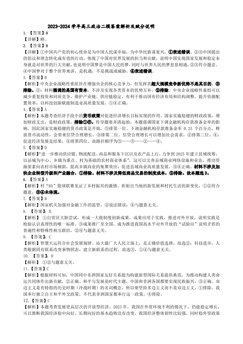 吉林省吉林市2024届高三上学期第二次模拟考试政治答案