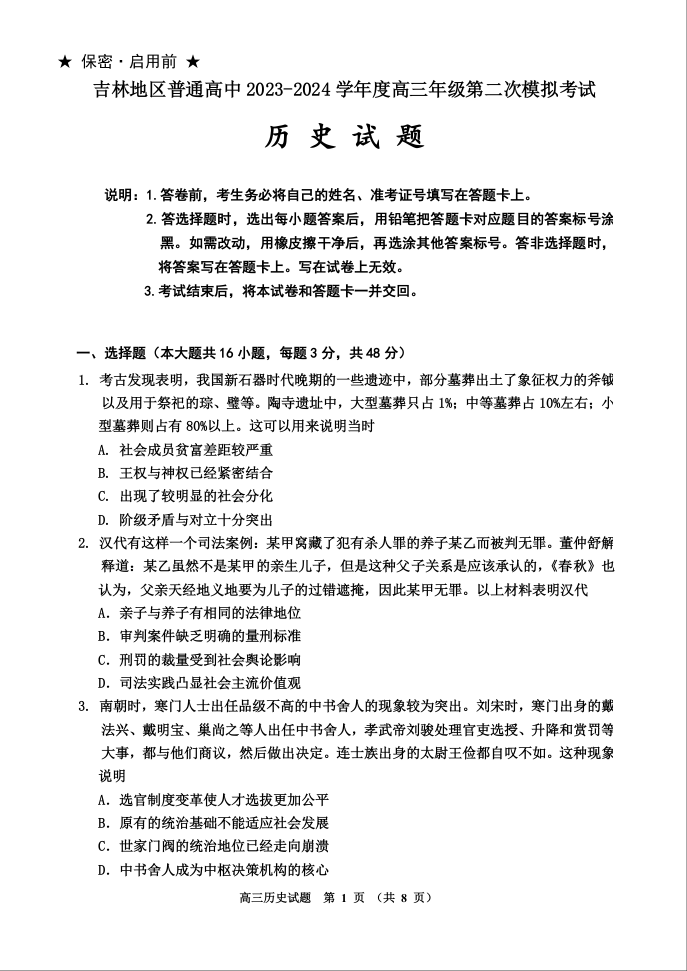 吉林省吉林市2024届高三上学期第二次模拟考试历史