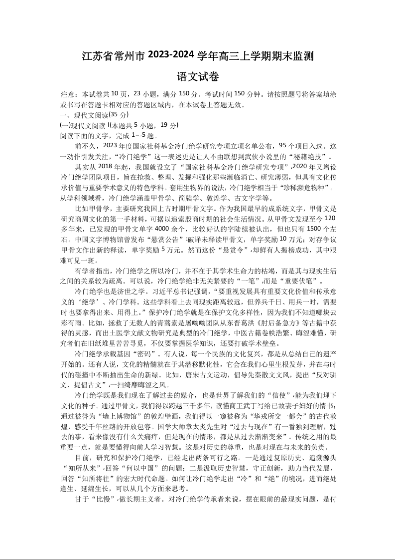 江苏省常州市2024届高三上学期期末学业水平监测语文