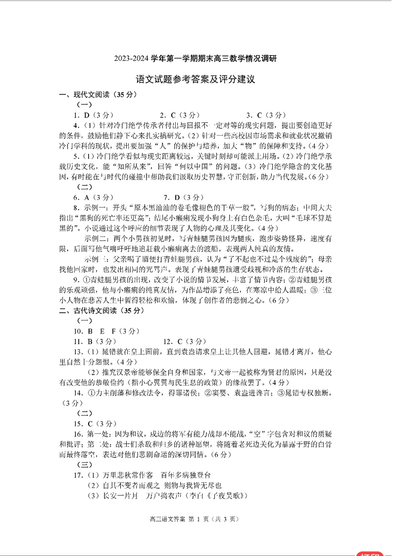 江苏省常州市2024届高三上学期期末学业水平监测语文答案