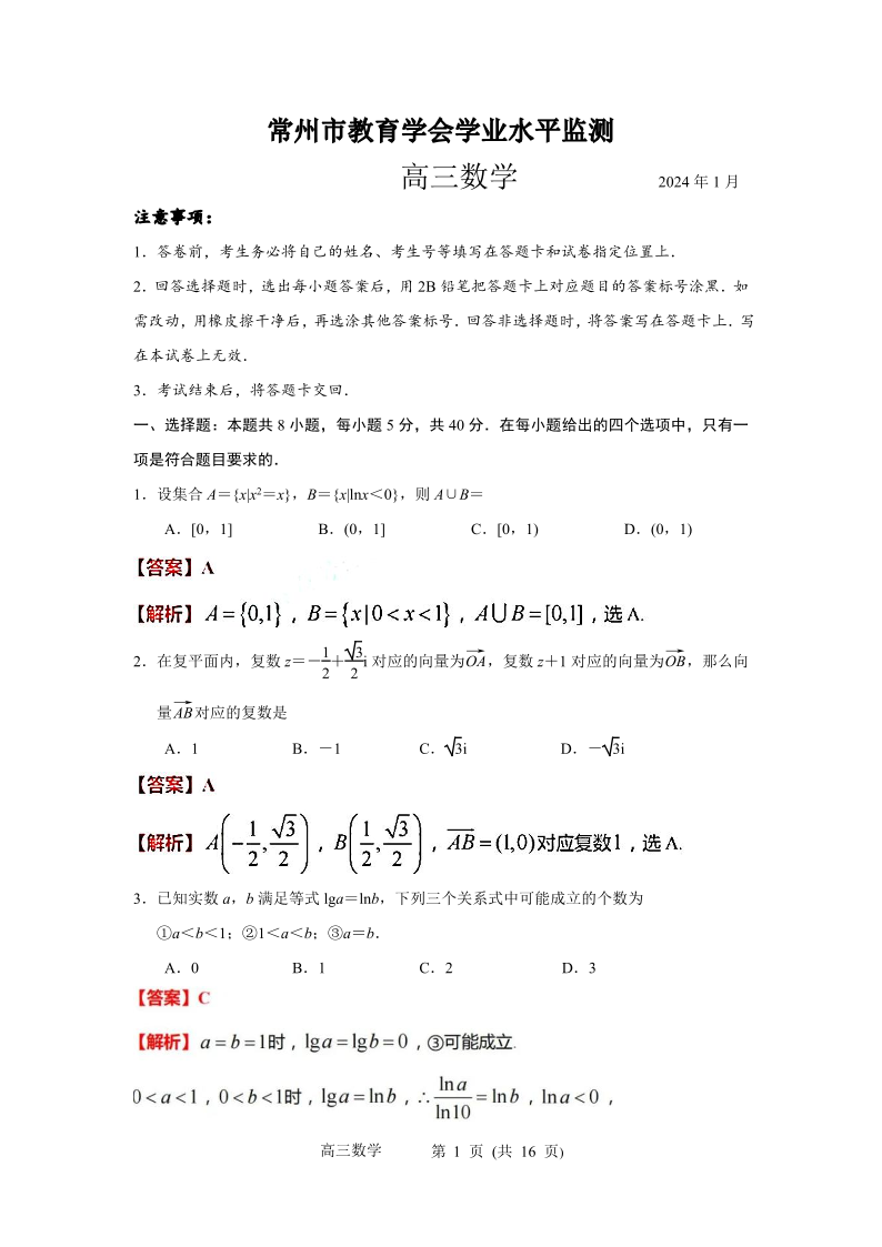 江苏省常州市2024届高三上学期期末学业水平监测数学(解析版)
