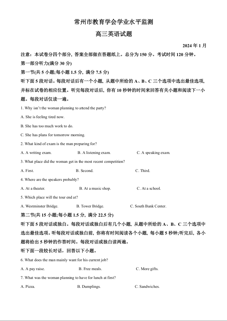 江苏省常州市2024届高三上学期期末学业水平监测英语(解析版)