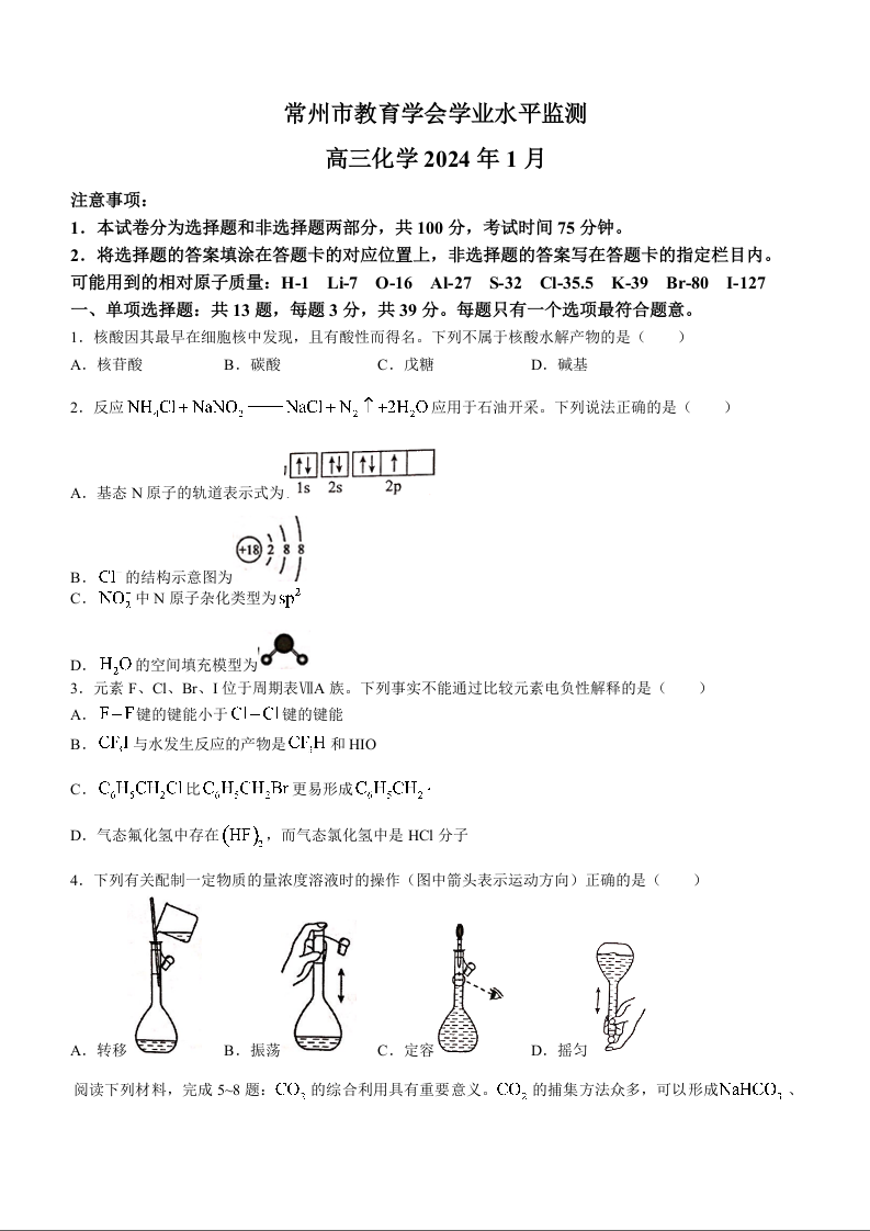 江苏省常州市2024届高三上学期期末学业水平监测化学+答案