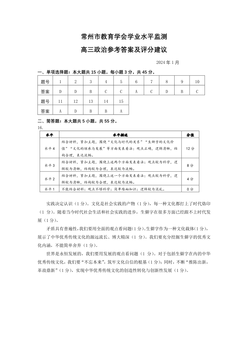 江苏省常州市2024届高三上学期期末学业水平监测政治答案