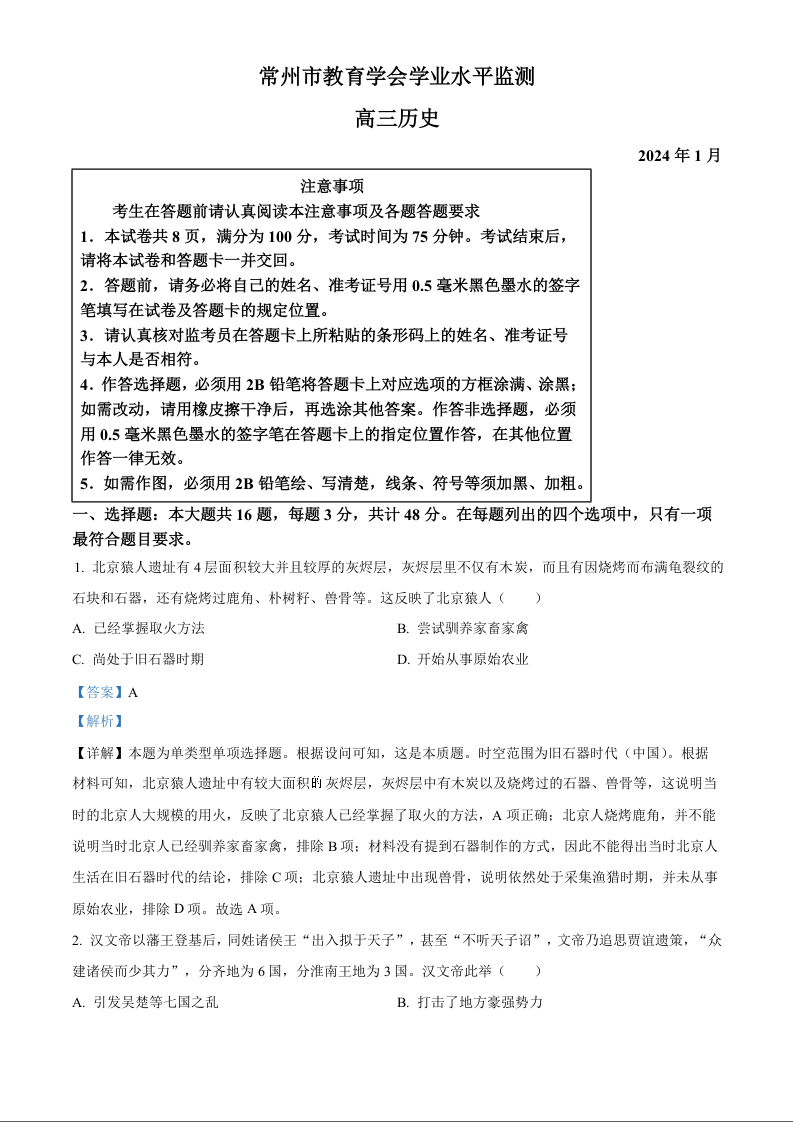 江苏省常州市2024届高三上学期期末学业水平监测历史(解析版)