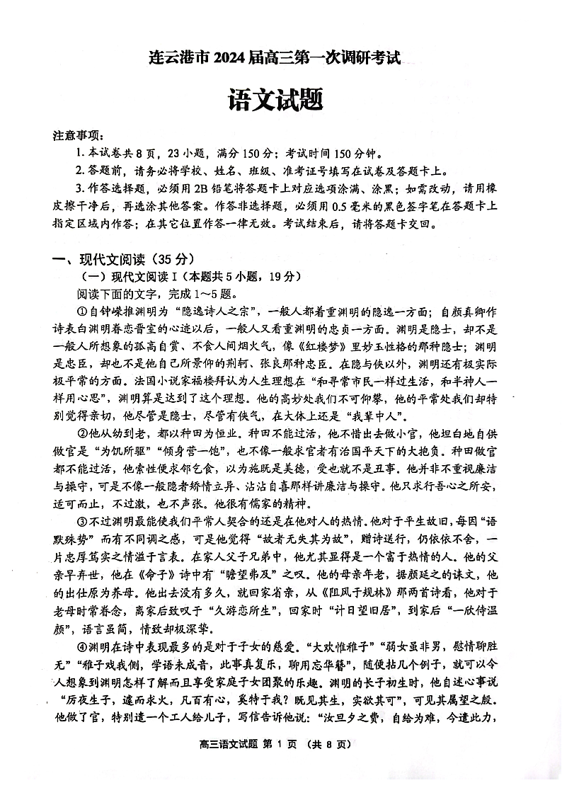 江苏省淮安市、连云港市2024届高三上学期第一次调研考试(一模)语文