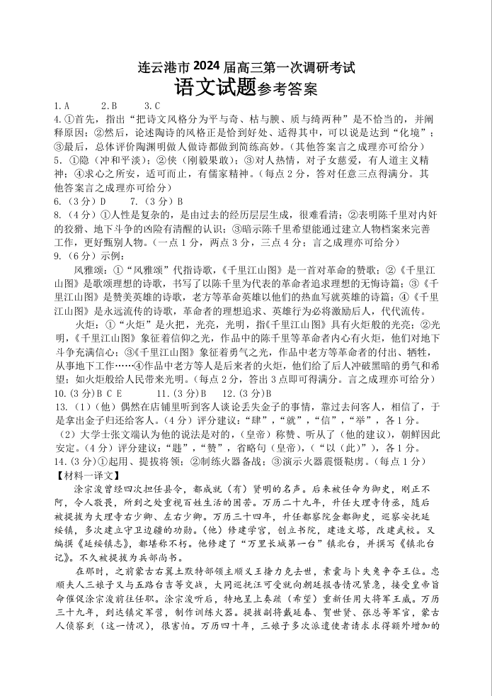 江苏省淮安市、连云港市2024届高三上学期第一次调研考试(一模)语文答案