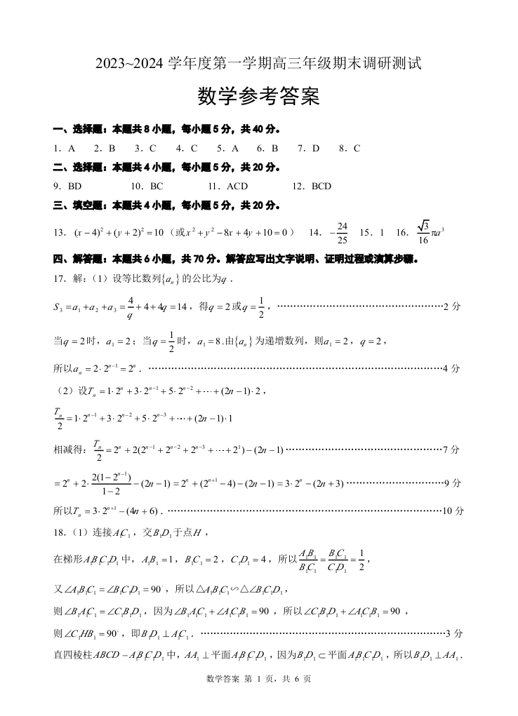 江苏省淮安市、连云港市2024届高三上学期第一次调研考试(一模)数学答案