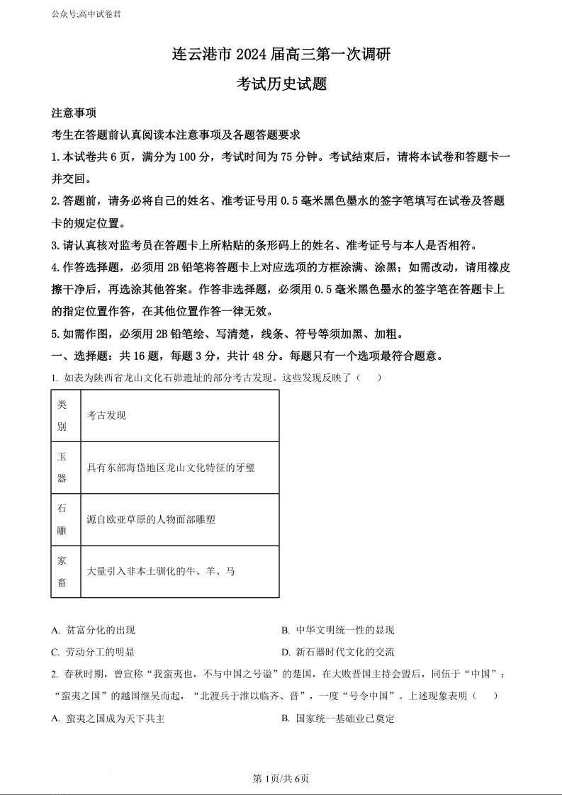 江苏省淮安市、连云港市2024届高三上学期第一次调研考试(一模)历史(原卷版)