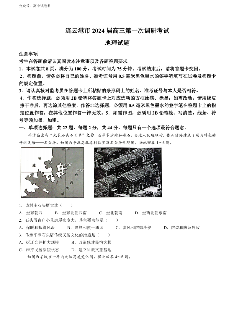 江苏省淮安市、连云港市2024届高三上学期第一次调研考试(一模)地理