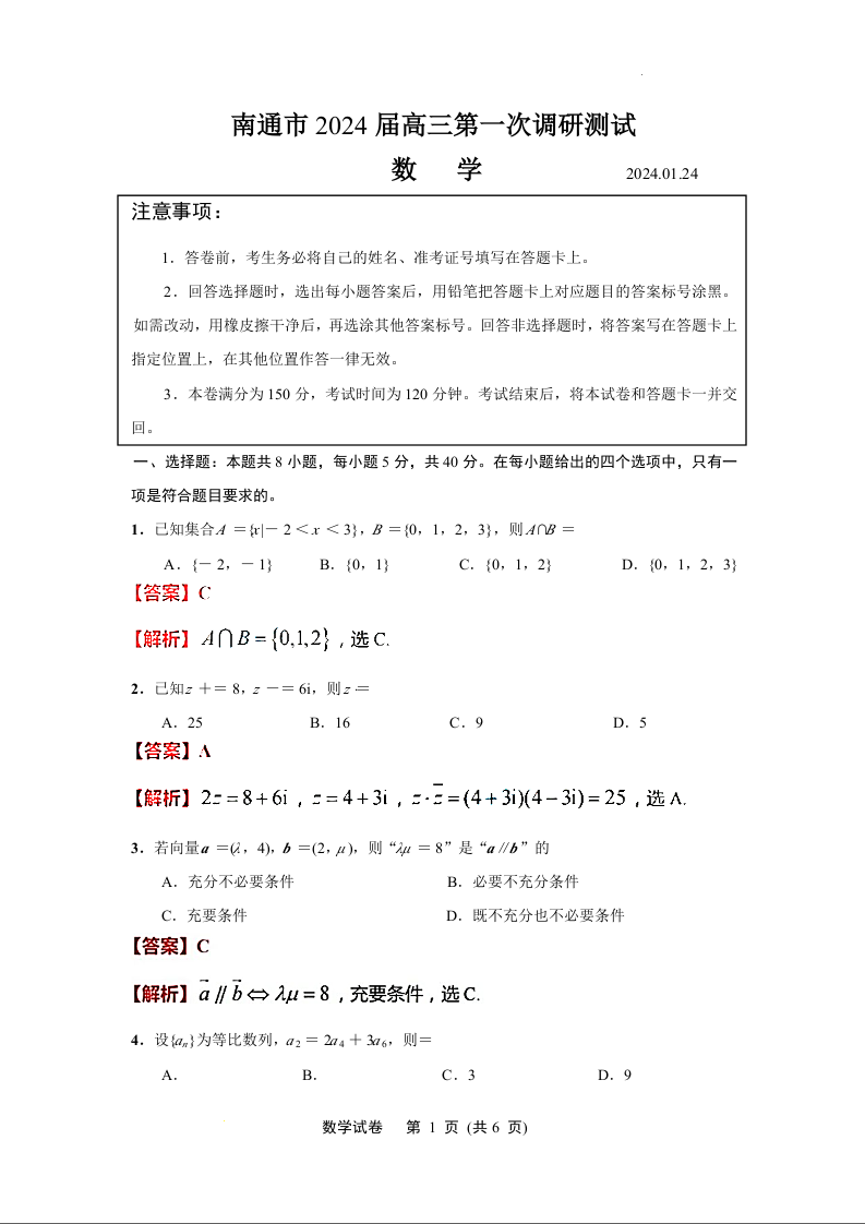 江苏省南通市2024届高三第一次调研测试(南通一模)数学(解析版)