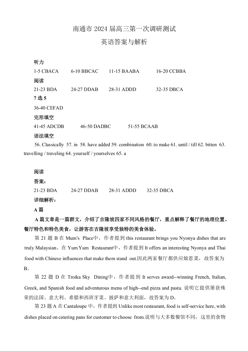 江苏省南通市2024届高三第一次调研测试(南通一模)英语答案