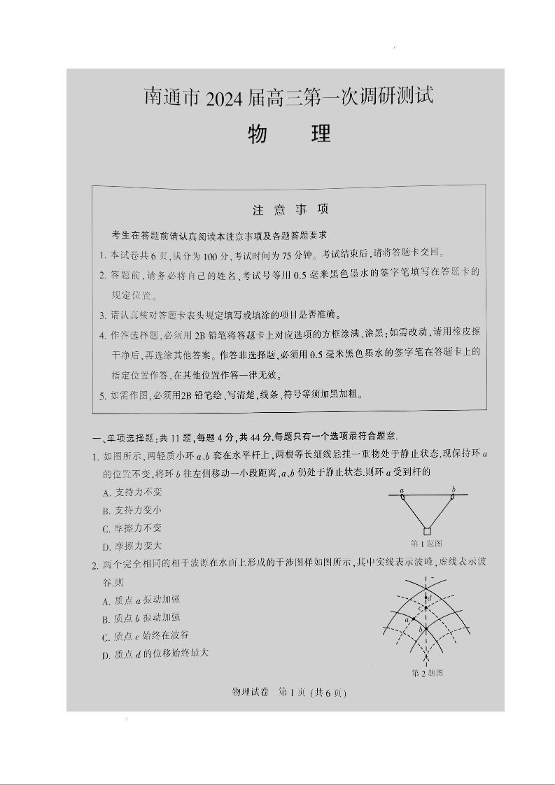江苏省南通市2024届高三第一次调研测试(南通一模)物理