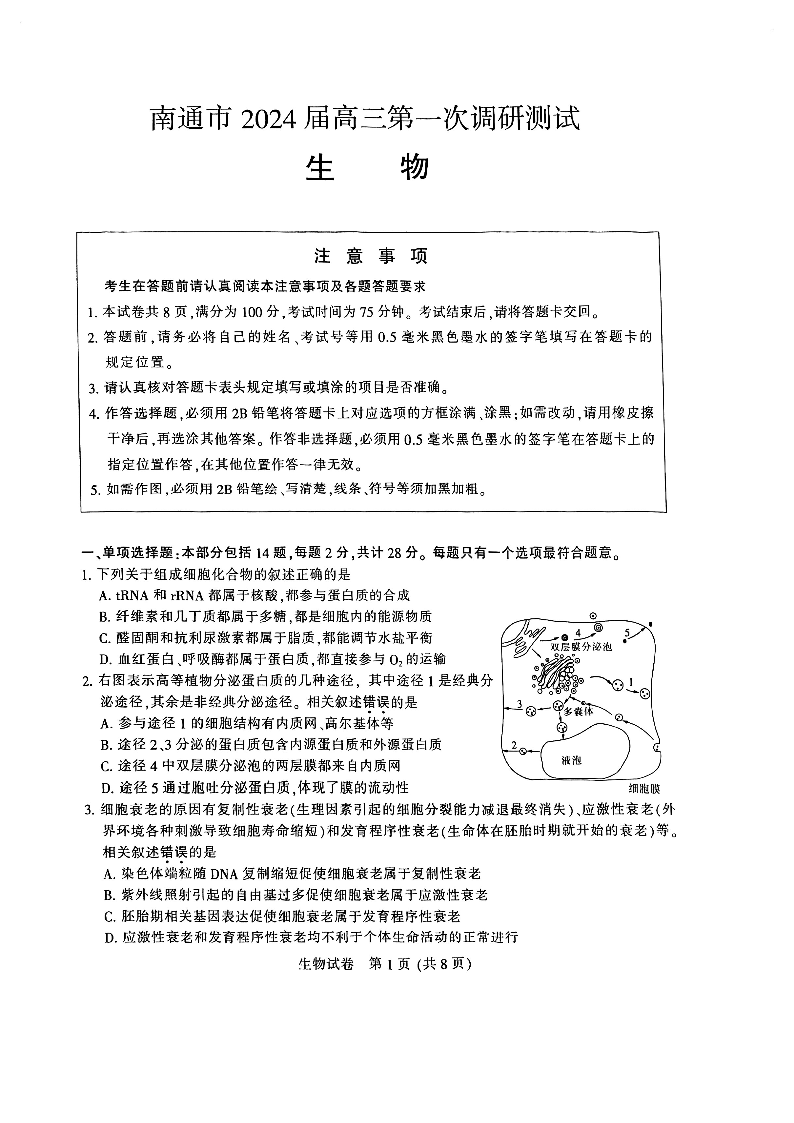 江苏省南通市2024届高三第一次调研测试(南通一模)生物