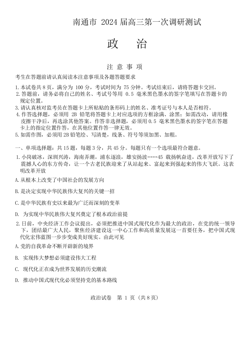 江苏省南通市2024届高三第一次调研测试(南通一模)政治
