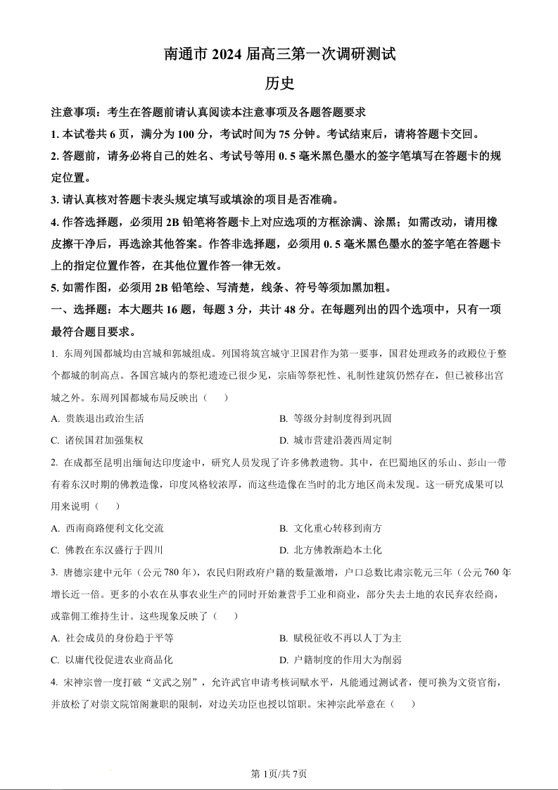 江苏省南通市2024届高三第一次调研测试(南通一模)历史(原卷版)