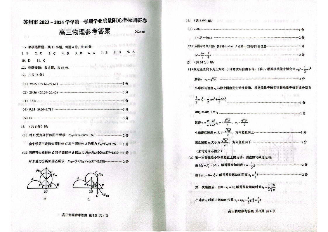 江苏省苏州市2024届高三上学期1月期末学业质量阳光指标调研物理答案