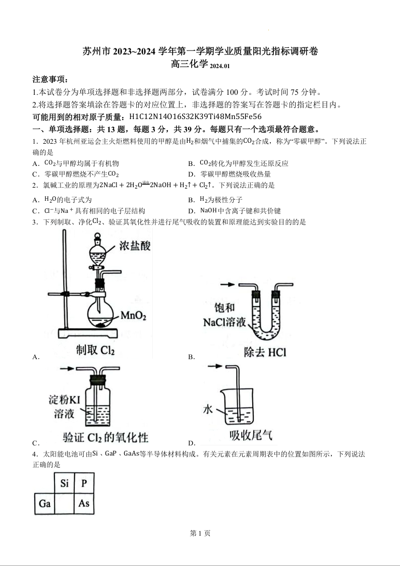 江苏省苏州市2024届高三上学期1月期末学业质量阳光指标调研化学