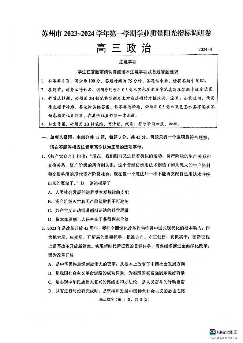 江苏省苏州市2024届高三上学期1月期末学业质量阳光指标调研政治