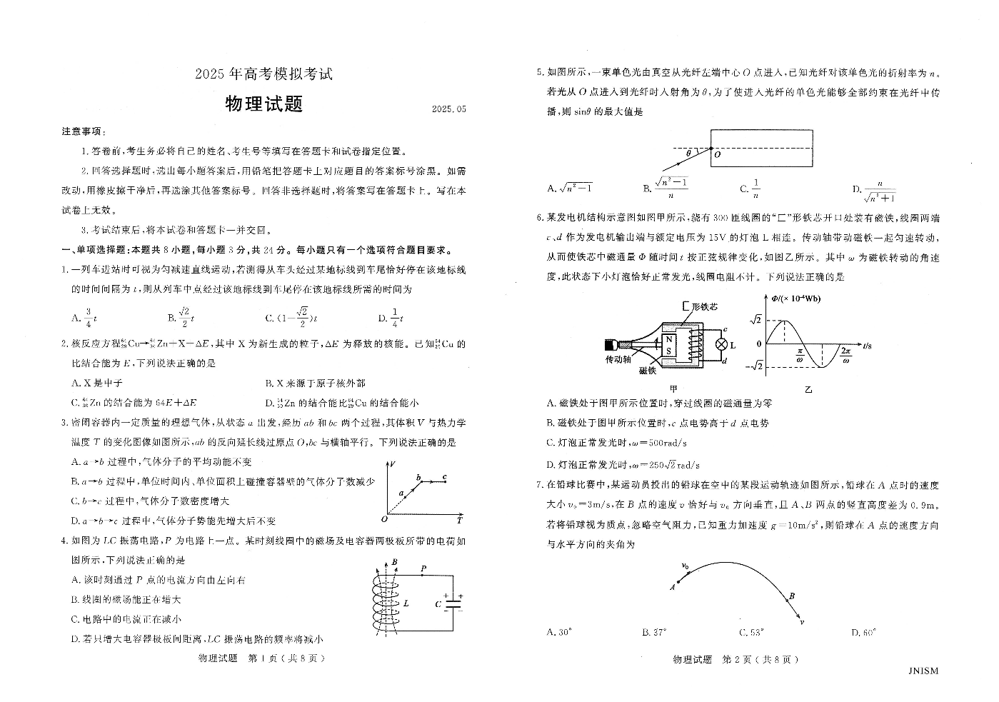 山东省济宁市2024-2025学年下学期5月高三三模物理