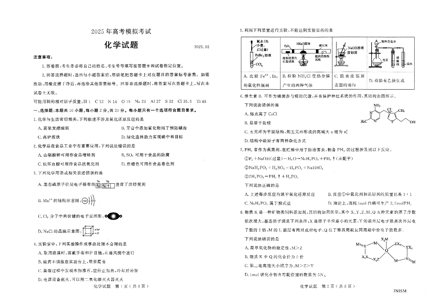 山东省济宁市2024-2025学年下学期5月高三三模化学