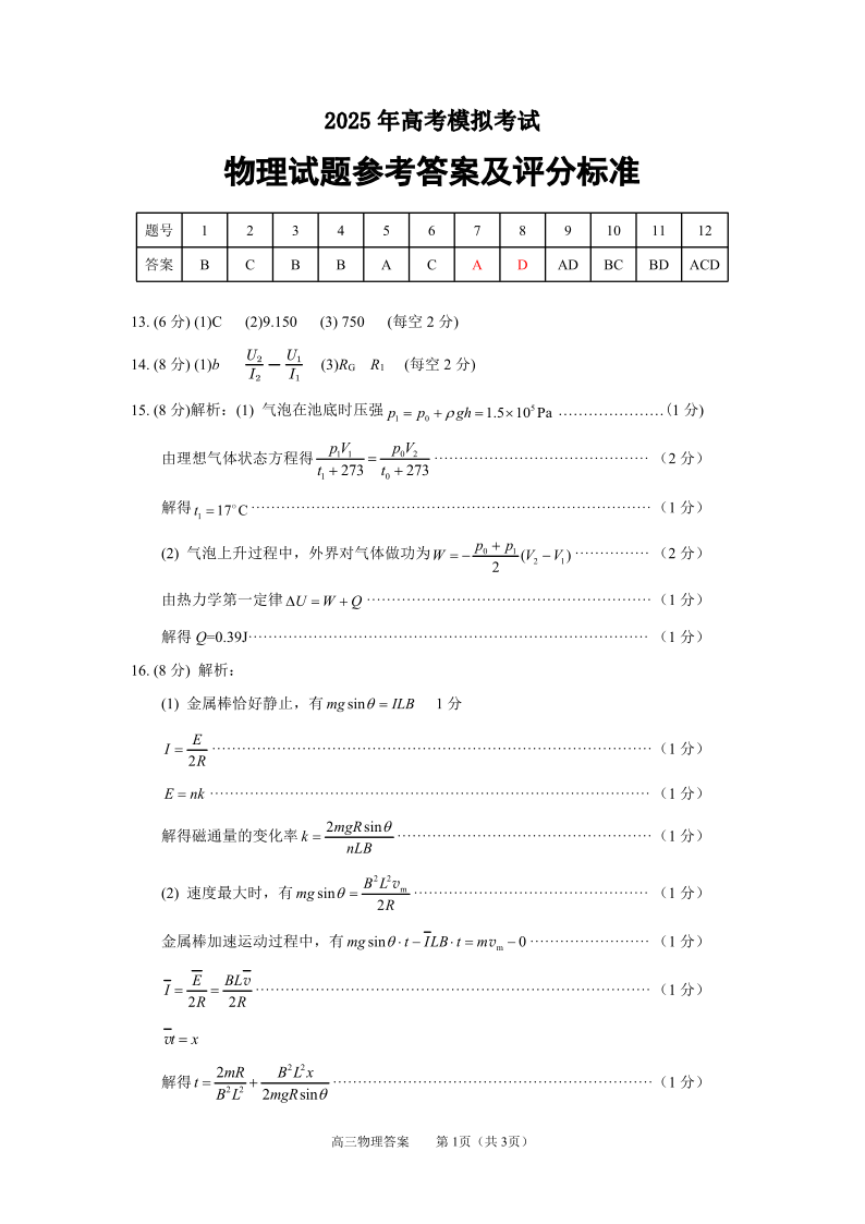 山东省济宁市2024-2025学年下学期5月高三三模物理答案-