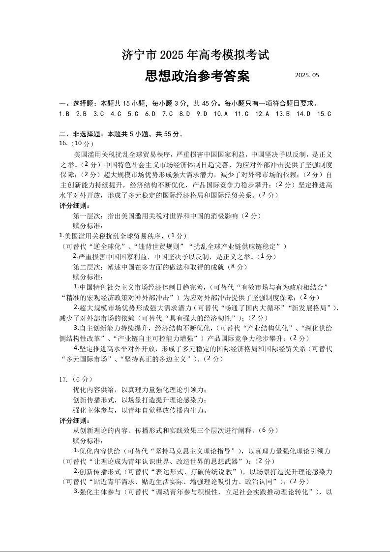 山东省济宁市2024-2025学年下学期5月高三三模政治评分细则