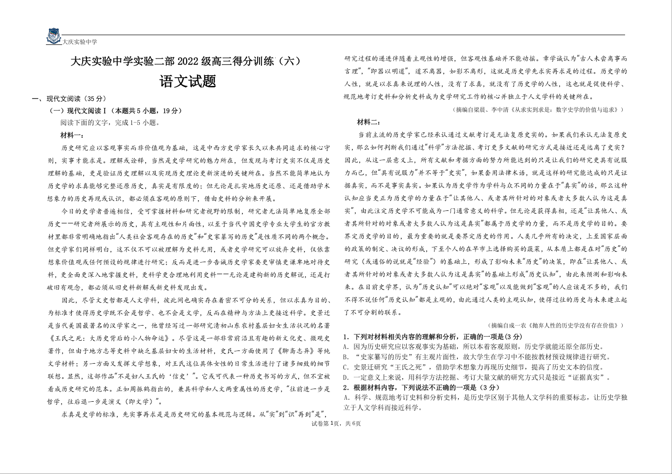 黑龙江省大庆实验中学2025届高三下学期得分训练(六)语文