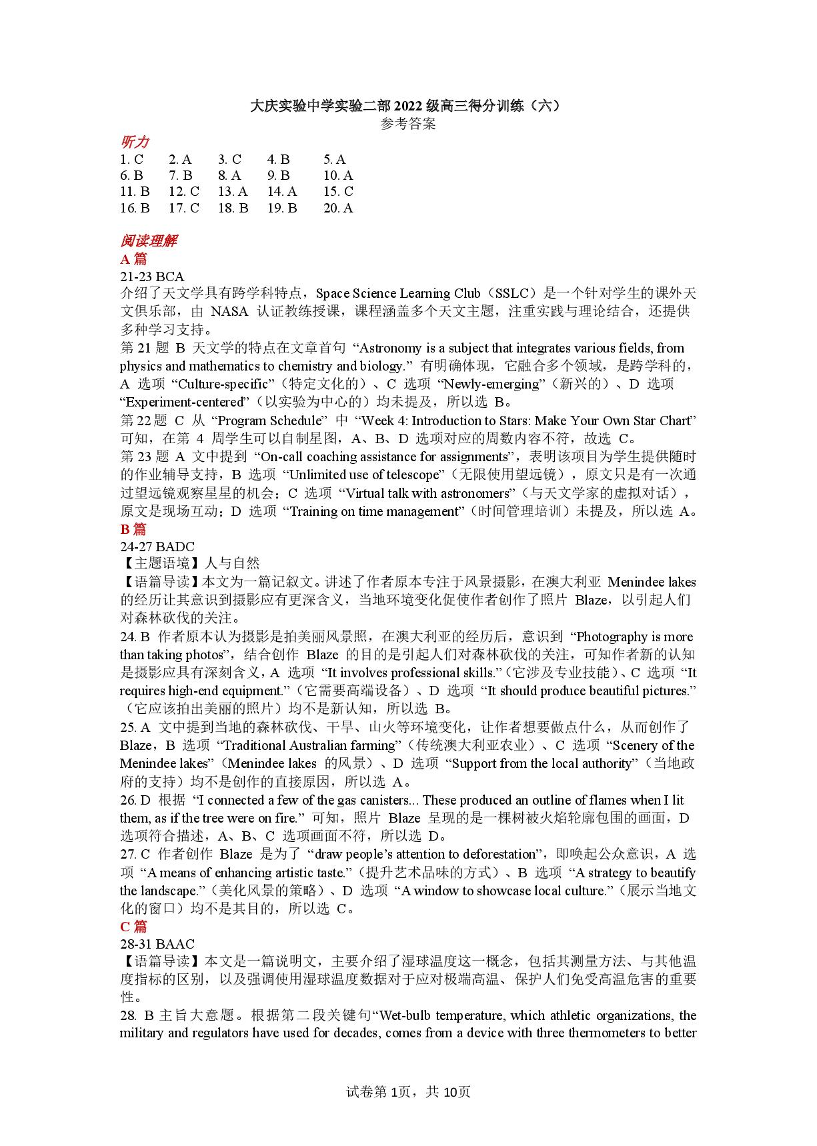 黑龙江省大庆实验中学2025届高三下学期得分训练(六)英语答案