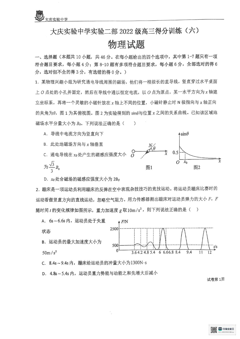 黑龙江省大庆实验中学2025届高三下学期得分训练(六)物理