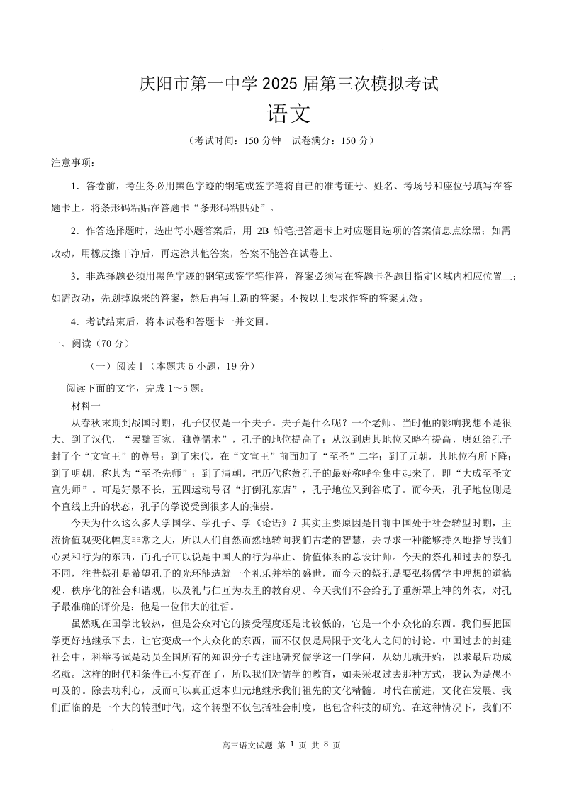 甘肃省庆阳第一中学2025届高三下学期第三次模拟考试语文(原卷版)