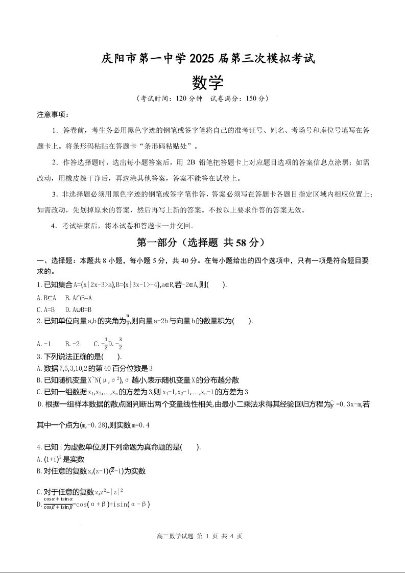 甘肃省庆阳第一中学2025届高三下学期第三次模拟考试数学(原卷版)