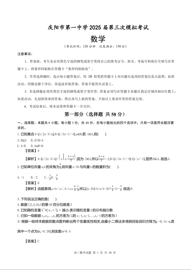 甘肃省庆阳第一中学2025届高三下学期第三次模拟考试数学(精品解析版)