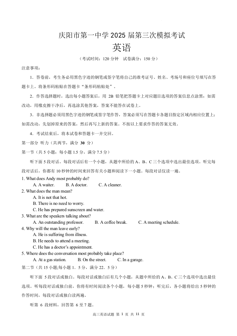 甘肃省庆阳第一中学2025届高三下学期第三次模拟考试英语(原卷版)