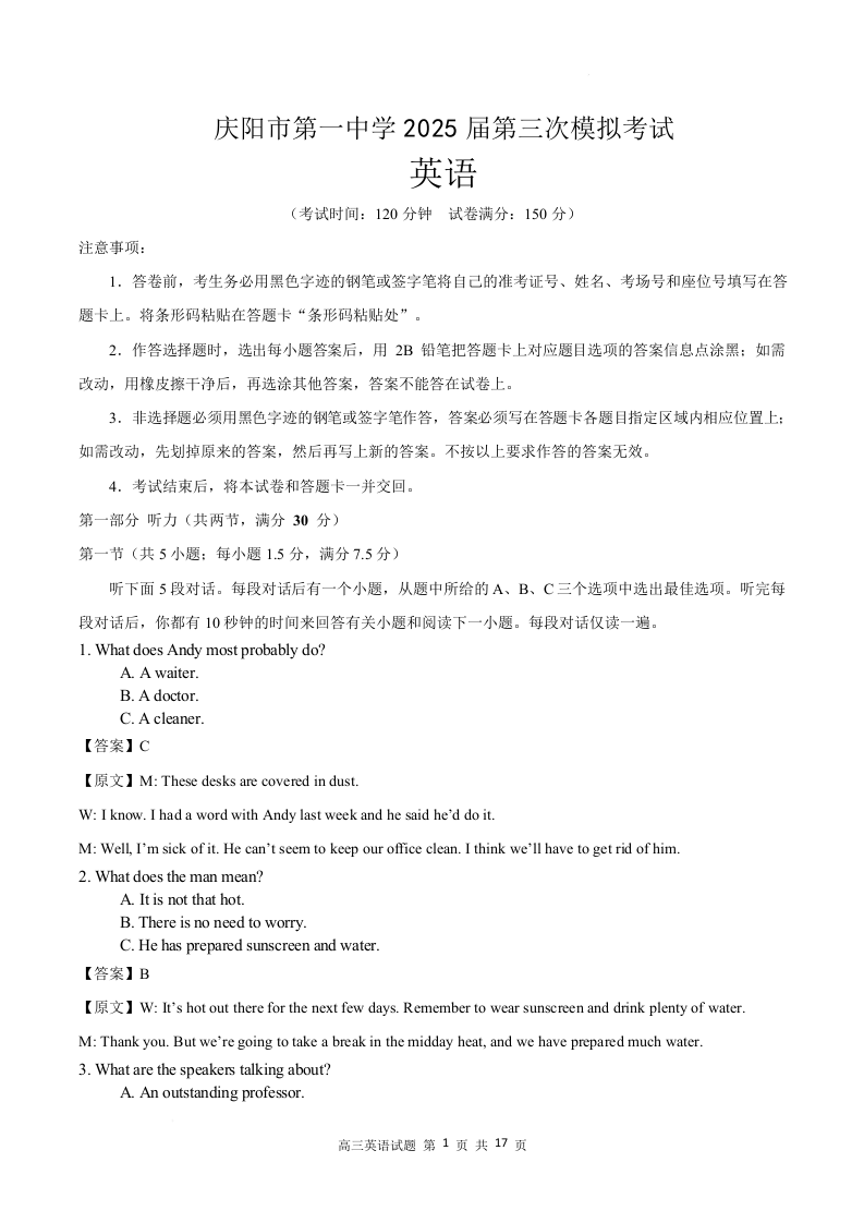 甘肃省庆阳第一中学2025届高三下学期第三次模拟考试英语(精品解析版)