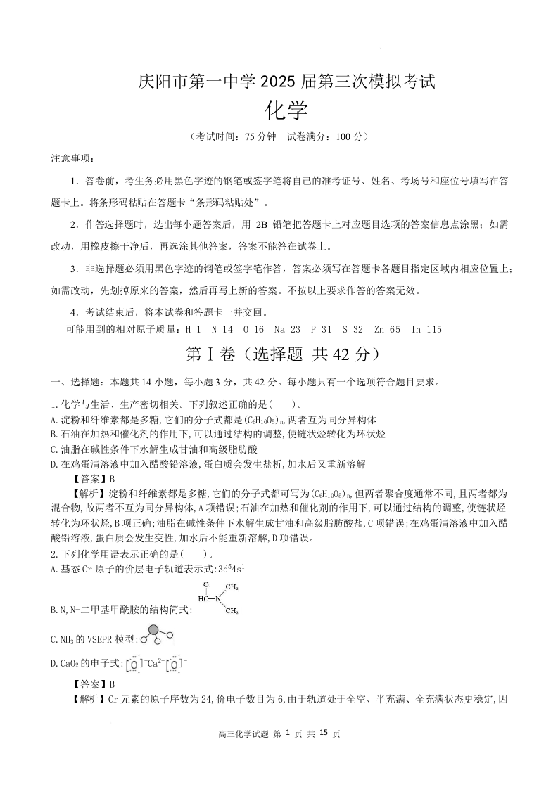 甘肃省庆阳第一中学2025届高三下学期第三次模拟考试化学(精品解析版)