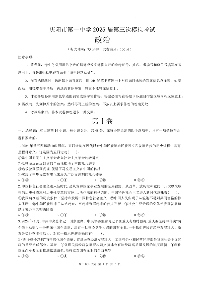 甘肃省庆阳第一中学2025届高三下学期第三次模拟考试政治(原卷版)