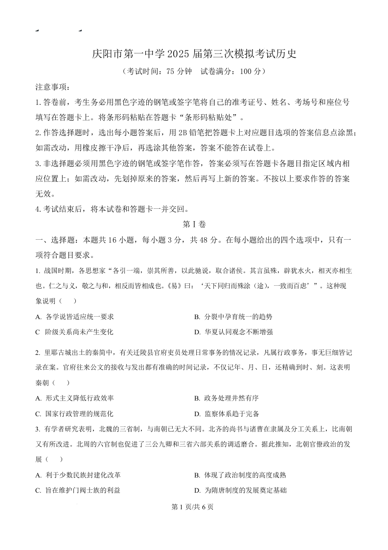 甘肃省庆阳第一中学2025届高三下学期第三次模拟考试历史(原卷版)