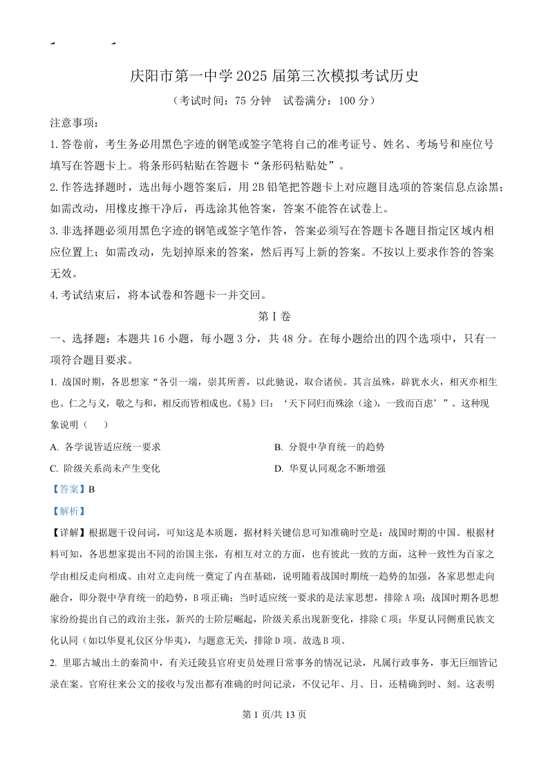 甘肃省庆阳第一中学2025届高三下学期第三次模拟考试历史(精品解析版)