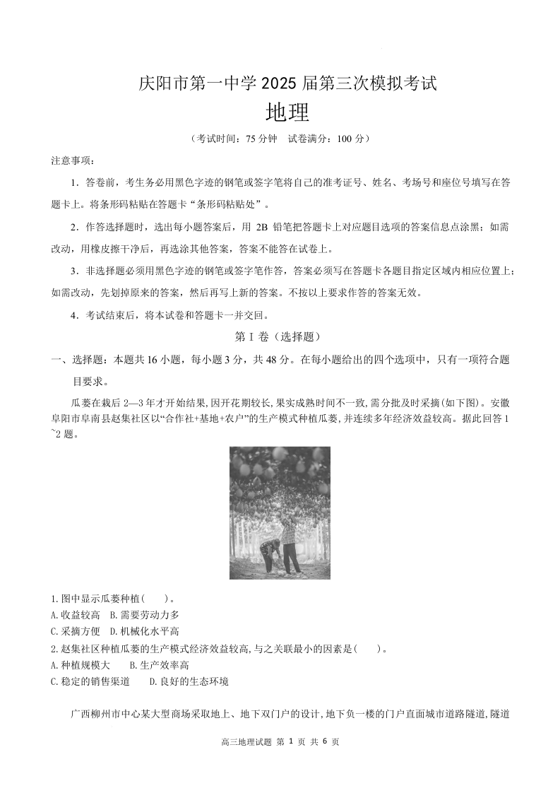 甘肃省庆阳第一中学2025届高三下学期第三次模拟考试地理(原卷版)