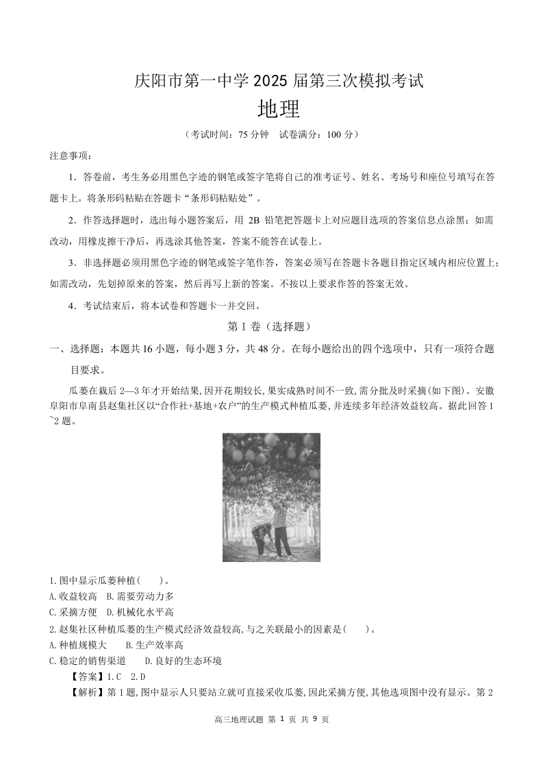 甘肃省庆阳第一中学2025届高三下学期第三次模拟考试地理(精品解析版)